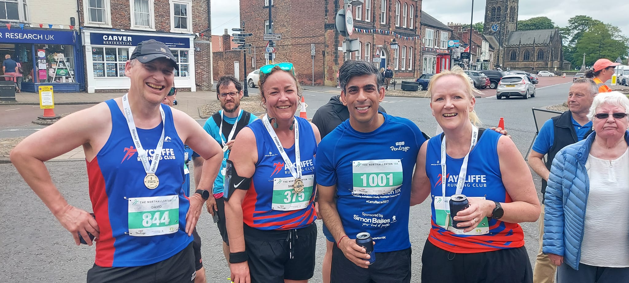 Northallerton 10k Rishi SunakOn Sunday 28 May, nine members took part in the Northallerton 10k.  This included  Richard Trowles (38:15) setting a new personal best for the distance.  Also taking part were Matt Muir setting another 10k personal best (40:06), Stuart Joyce (41:41), Gary O’Connor (43:31), Dave Blewitt (46:58), Angela Sutheran (50:36), David Stothard (56:28), Samantha Harding (1:00:02) and Yvonne Blewitt (1:02:58).  Members were also lucky enough to bump into the Prime Minister, Rishi Sunak at the end of the race as he was also taking part.  It is not every day that members get the opportunity to say that they beat the Prime Minister but it shows that everyone can get out and run and good to see him having photos with the runners at the end of the race.